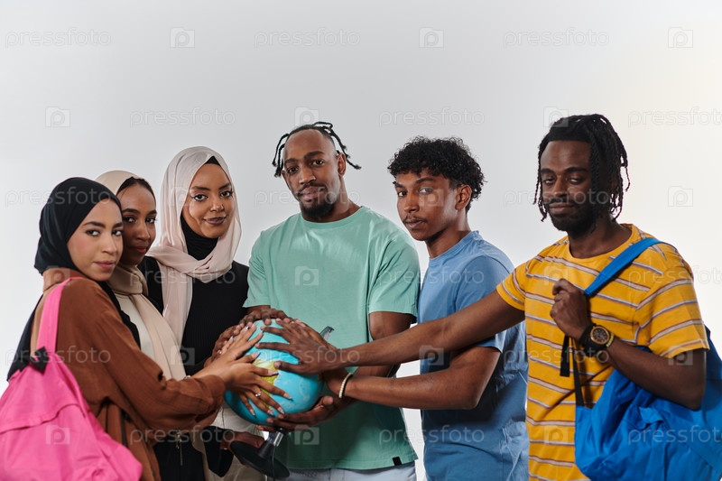 Разнообразная группа студентов собралась по всему миру, поглощенная исследованиями и учебой, их яркая энергия запечатлена на первозданном белом фоне, символизируя единство и любопытство в их образовательном путешествии