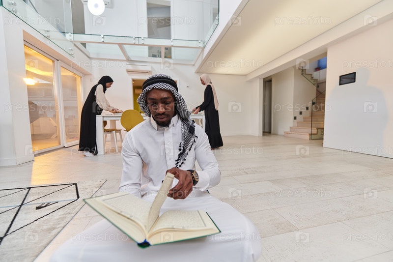 В священный месяц Рамадан афроамериканец-мусульманин, поглощенный чтением Священного Корана, окружен фоном, на котором три женщины в хиджабе готовят и подают еду для ифтара, изображая сцену духовной преданности, культурного единства и общественного праздн