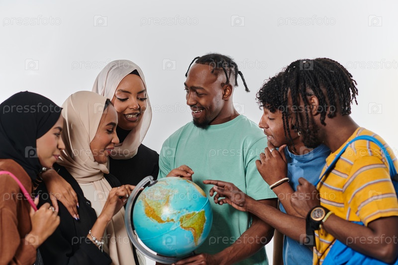 Разнообразная группа студентов собралась по всему миру, поглощенная исследованиями и учебой, их яркая энергия запечатлена на первозданном белом фоне, символизируя единство и любопытство в их образовательном путешествии