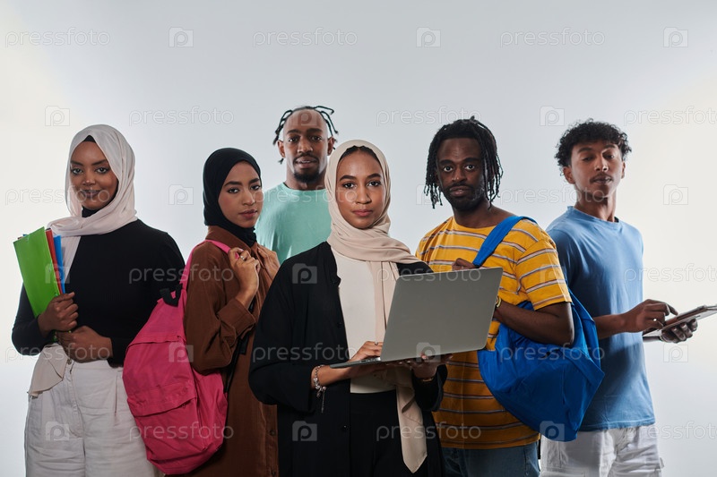 Группа разнообразных студентов занимается современными образовательными практиками, используя различные технологические инструменты, такие как ноутбуки, планшеты и смартфоны, на чистом белом фоне, иллюстрируя современный подход к совместному обучению и до