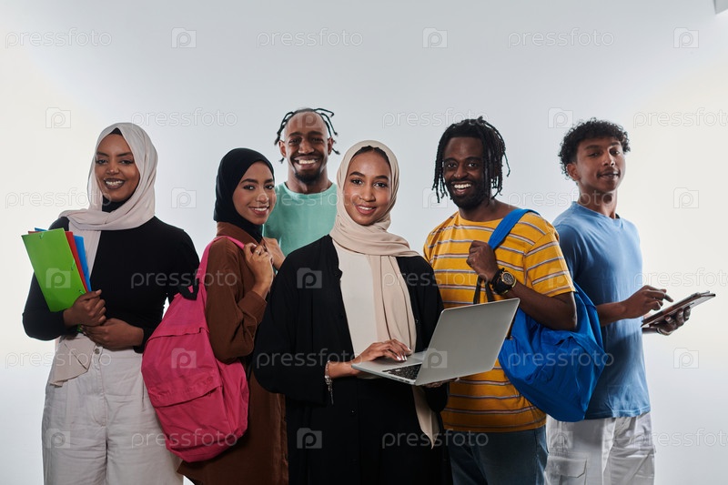 Группа разнообразных студентов занимается современными образовательными практиками, используя различные технологические инструменты, такие как ноутбуки, планшеты и смартфоны, на чистом белом фоне, иллюстрируя современный подход к совместному обучению и до
