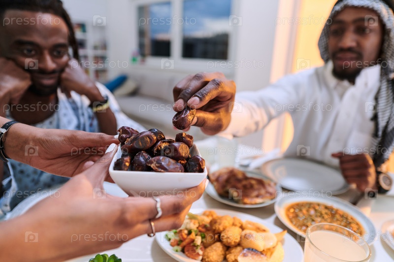 На пронзительном крупном плане разные руки мусульманской семьи деликатно сжимают свежие финики, символизируя прекращение поста во время священного месяца Рамадан, запечатлевая момент культурного единства, общих традиций и радостного ожидания общего ифтара