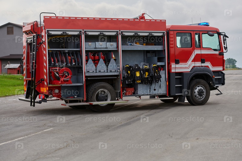 В этой захватывающей сцене современная пожарная машина, оснащенная передовыми спасательными технологиями, вместе со своей опытной пожарной командой готова вмешаться и быстро отреагировать на чрезвычайные ситуации, обеспечивая безопасность и защиту населен