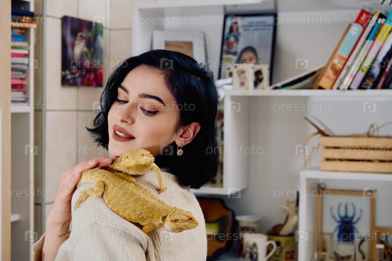 Красивая женщина позирует со своими двумя очаровательными бородатыми драконами