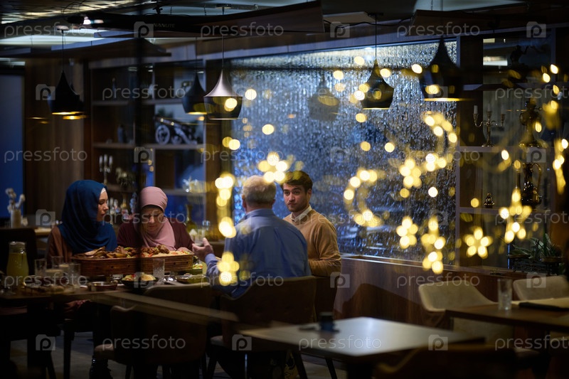 Современная и традиционная европейская исламская семья собирается вместе на ифтар в современном ресторане во время поста Рамадан, олицетворяя культурную гармонию и семейное единство среди кулинарного праздника разнообразия