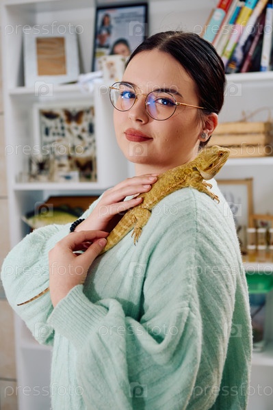 Красивая женщина позирует со своими очаровательными бородатыми драконами