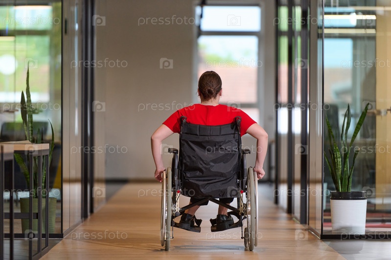 Современная молодая деловая женщина в инвалидной коляске окружена инклюзивным рабочим пространством со стеклянными офисами, олицетворяющим решимость и новаторство в деловом мире