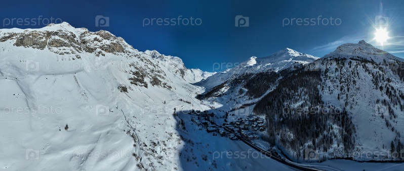 Зимний снимок лыжных трасс и склонов, покрытых свежим снегом, с дрона в Тине, Валдизер, Франция