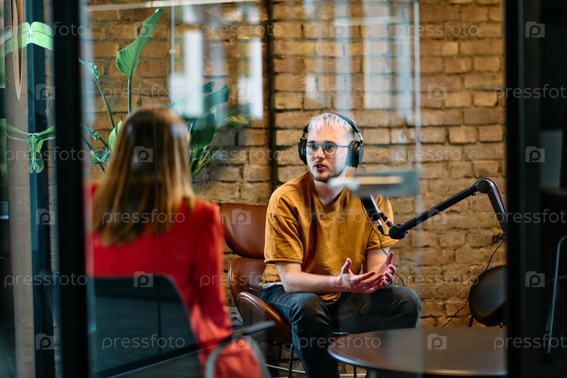 Собрание молодых бизнес-профессионалов, некоторые из которых сидят в офисе со стеклянными стенами, ведут оживленную беседу и записывают онлайн-подкаст, олицетворяющий современное сотрудничество и динамичное взаимодействие