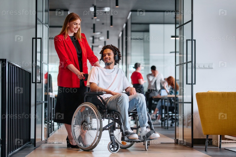 Бизнес-лидер со своим коллегой, афроамериканским бизнесменом-инвалидом, проходят мимо своих коллег, работающих в современных офисах