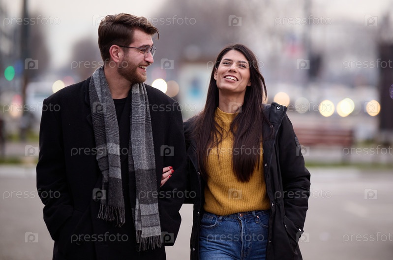 Романтическая пара нежно обнимается, прогуливаясь по улицам города, наслаждаясь вместе досугом в компании друг друга