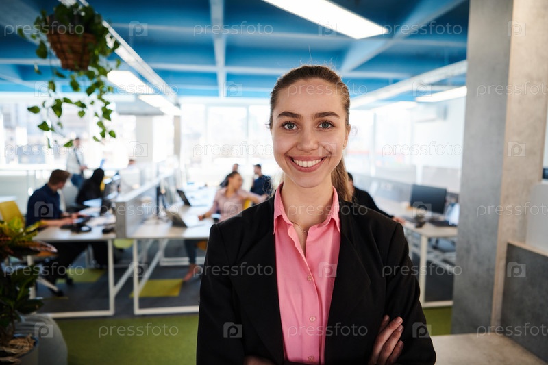 Портрет молодой улыбающейся деловой женщины в творческом коворкинг-стартапе на открытом пространстве. Успешная деловая женщина, стоящая в офисе с копировальным пространством. Коллеги работают в фоновом режиме