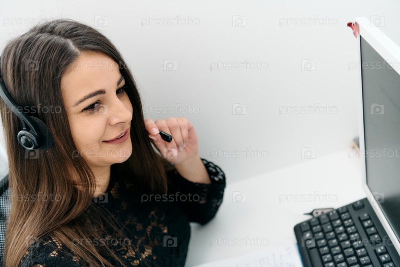 Дружелюбный агент колл-центра отвечает на входящие звонки с помощью гарнитуры, обеспечивая удаленное обслуживание клиентов