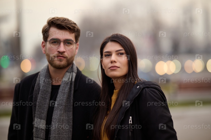 Романтическая пара нежно обнимается, прогуливаясь по улицам города, наслаждаясь вместе досугом в компании друг друга