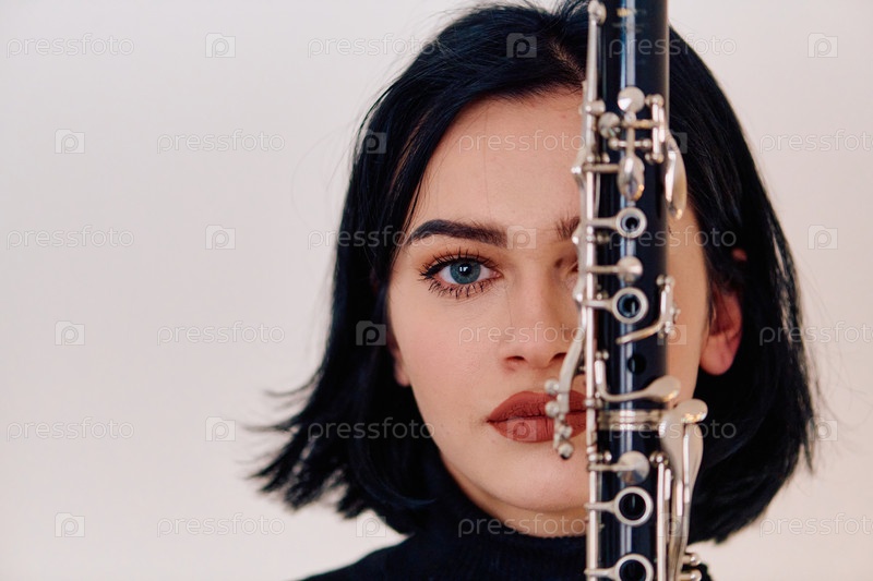 Изящная брюнетка-музыкантка позирует с кларнетом на белом фоне
