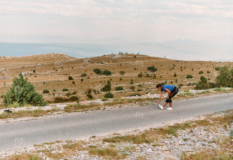 Решительная спортсменка растягивается после интенсивного бега по пересеченной горной местности