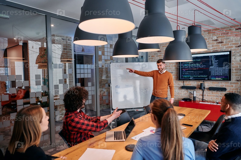 В корпоративной обстановке бизнесмен проводит встречу, страстно представляя бизнес-план своей внимательной команде, способствуя сотрудничеству и стратегическому мышлению