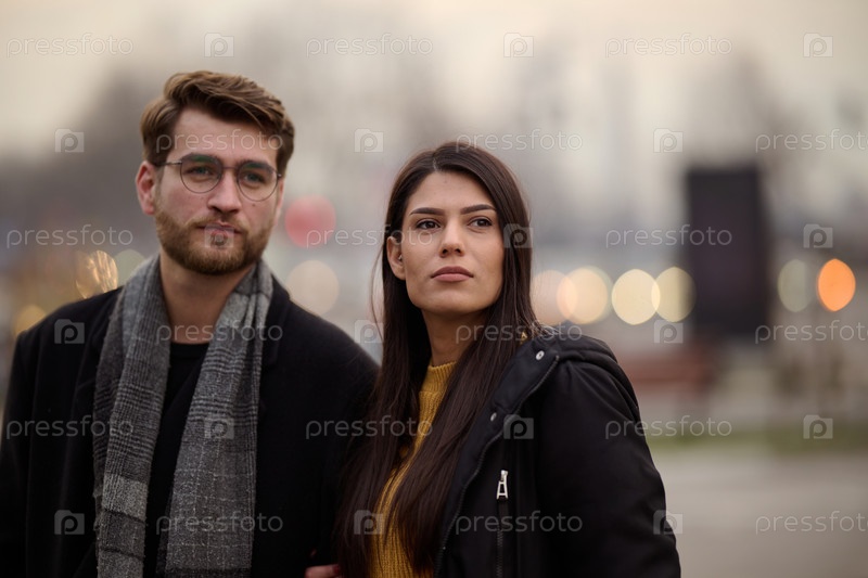 Романтическая пара нежно обнимается, прогуливаясь по улицам города, наслаждаясь вместе досугом в компании друг друга