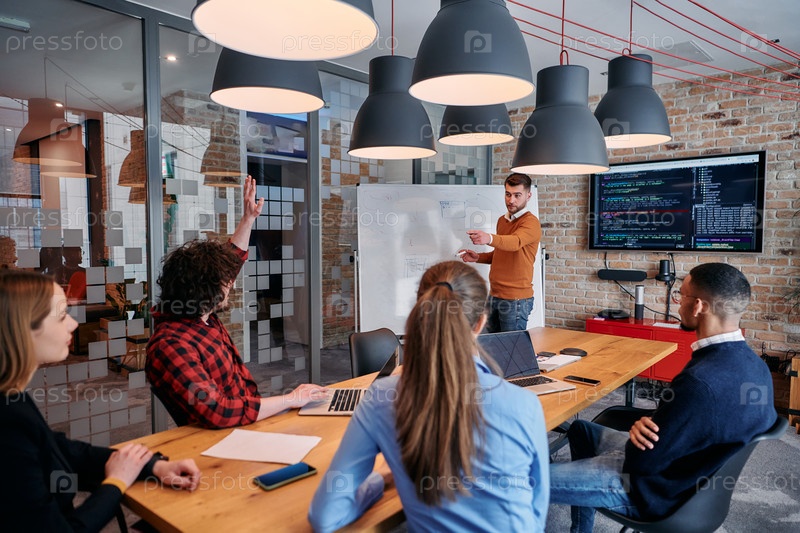 В корпоративной обстановке бизнесмен проводит встречу, страстно представляя бизнес-план своей внимательной команде, способствуя сотрудничеству и стратегическому мышлению