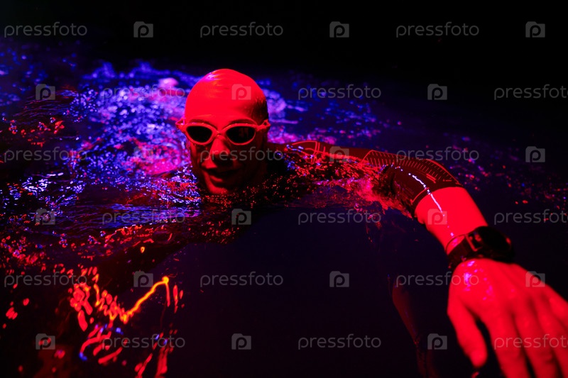 Настоящий пловец-триатлет, отдыхающий во время тяжелых тренировок при ночном неоновом гелевом свете