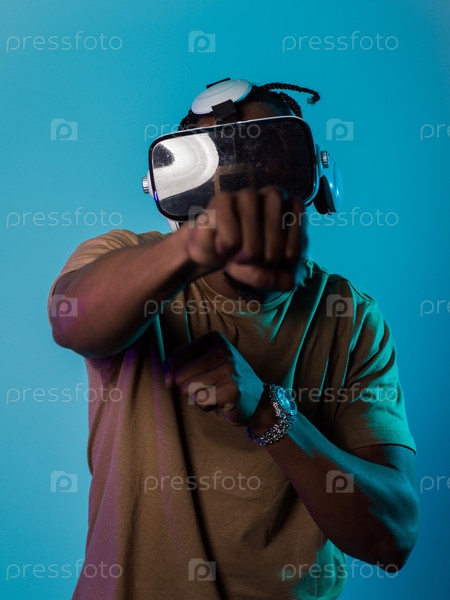 В авангардной сцене афроамериканец участвует в передовых играх виртуальной реальности, используя очки VR для погружения в футуристические боксерские игры, расположенные на ярко-синем фоне, демонстрируя плавное сочетание технологий, инноваций и взаимодейст