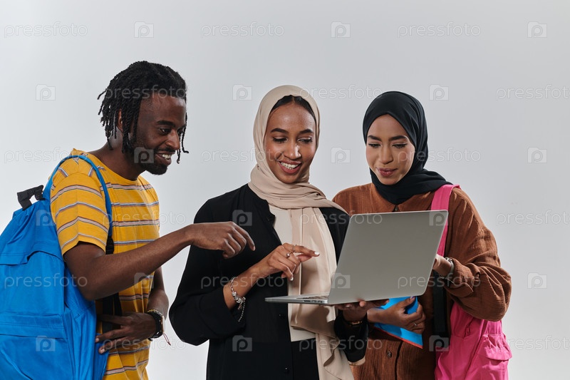 Группа студентов, в том числе афроамериканская студентка и две женщины в хиджабах, стоят вместе на первозданном белом фоне, символизируя гармоничное сочетание культур и традиций в стремлении к знаниям и академическому совершенству