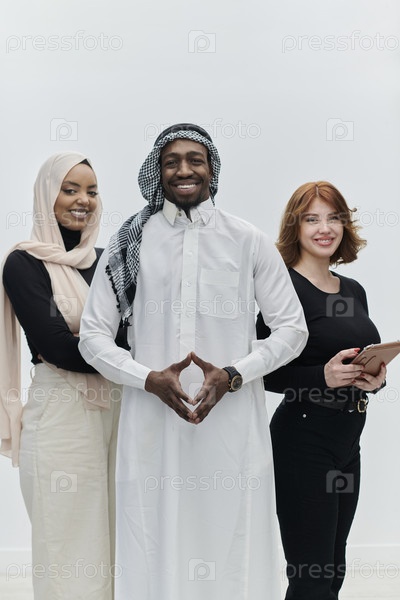 Арабский бизнесмен уверенно стоит рядом с двумя деловыми женщинами, изображая уравновешенную и разнообразную команду, олицетворяющую амбиции, инновации и дальновидное лидерство на первозданном белом фоне