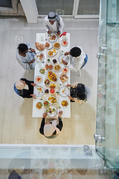 Вид сверху: традиционная и разнообразная мусульманская семья собирается вместе, чтобы разделить вкусный ифтар во время священного месяца Рамадан, воплощая суть семейной радости, культурного богатства и духовного единства в их общем празднике