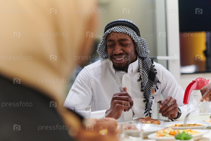 Традиционная и разнообразная мусульманская семья собирается вместе, чтобы разделить вкусный ифтар во время священного месяца Рамадан, воплощая суть семейной радости, культурного богатства и духовного единства в их общем празднике
