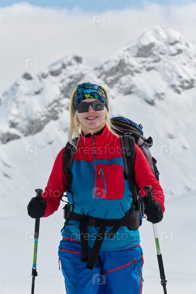 Женщина-альпинистка поднимается в Альпы со снаряжением для бэккантри