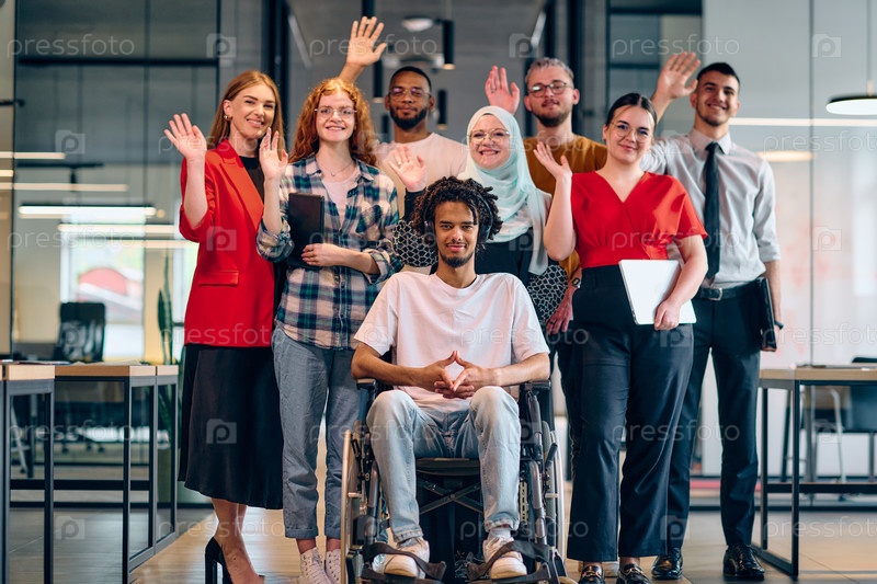 Разнообразная группа молодых бизнесменов, идущих по коридору в застекленном офисе современного стартапа, включая человека в инвалидной коляске и женщину в хиджабе