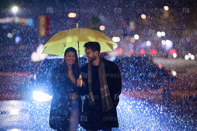 В романтической атмосфере дождливой ночи счастливая пара прогуливается по городу, разделяя нежные моменты под желтым зонтиком, в окружении сверкающего сияния городских огней