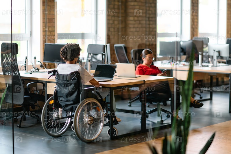 Молодая бизнес-группа, в том числе афроамериканский бизнесмен в инвалидной коляске, сотрудничает в современном стеклянном офисе, активно работает за компьютером и ноутбуком, коллективно и решительно решая разнообразные бизнес-задачи