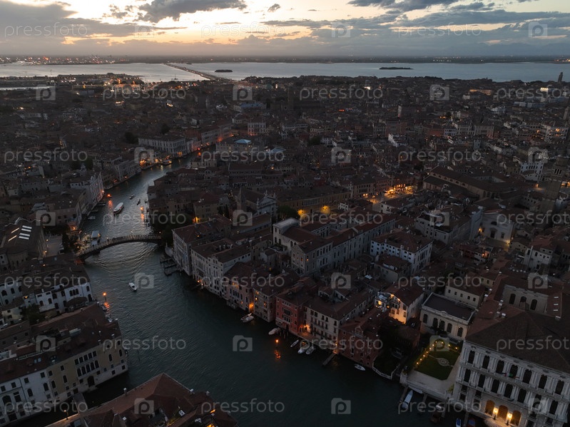 Панорамная достопримечательность Венеции на закате или ночью, вид с воздуха на площадь Сан-Марко