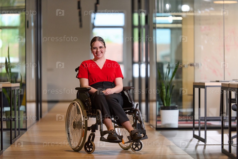 Современная молодая деловая женщина в инвалидной коляске окружена инклюзивным рабочим пространством со стеклянными офисами, олицетворяющим решимость и новаторство в деловом мире