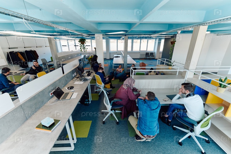 В современном стартап-офисе группа молодых и способных бизнесменов оживленно обсуждает различные проекты, демонстрируя командную работу, инновации и предпринимательский дух