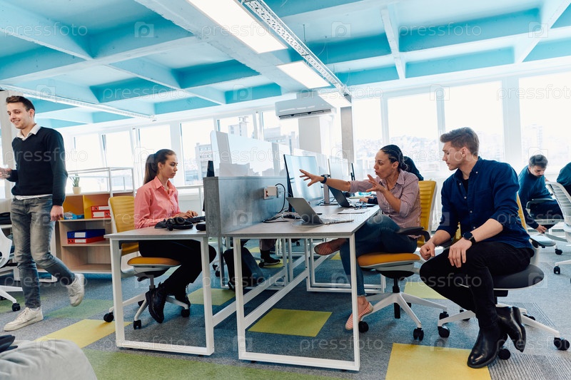 Совместный процесс мультикультурной квалифицированной молодой бизнес-команды во время мозгового штурма в офисе. Разнообразная группа молодых людей, одетых в формальную одежду, сотрудничает в разработке дизайн-проекта