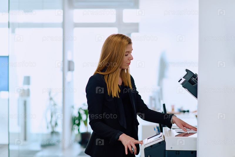 Блондинка-бизнесмен, использующая принтер в офисе