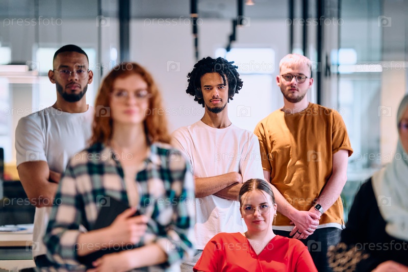 Разнообразная группа молодых бизнесменов, идущих по коридору в застекленном офисе современного стартапа, включая человека в инвалидной коляске и женщину в хиджабе