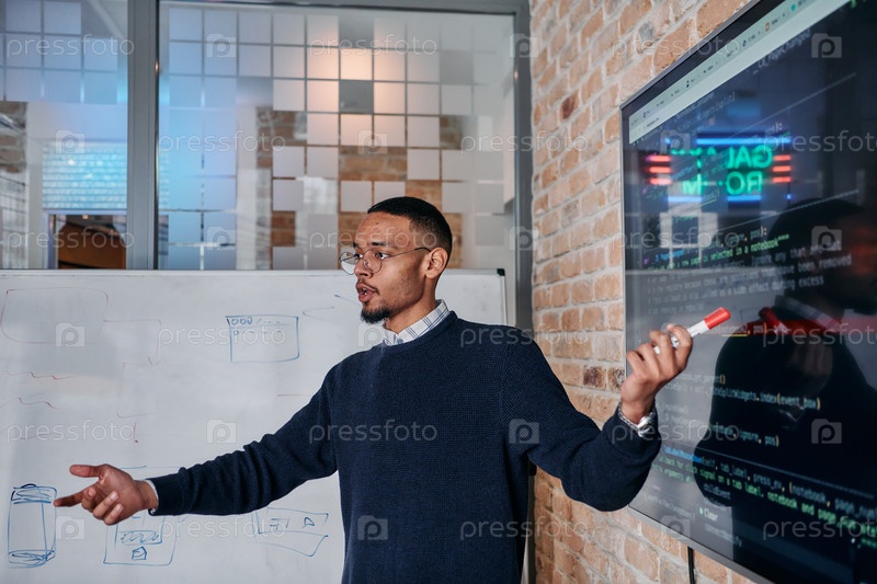 Афроамериканский бизнесмен убедительно презентует свою бизнес-стратегию своим коллегам, способствуя сотрудничеству и дальновидному мышлению