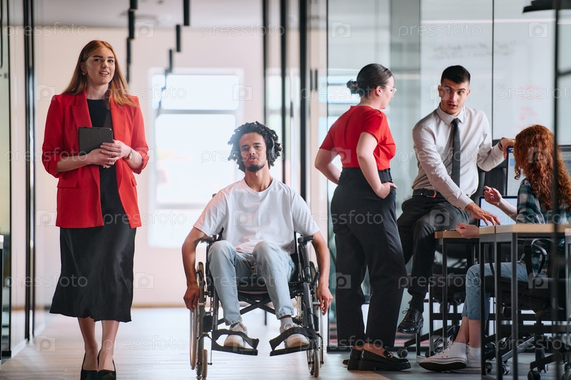 Бизнес-лидер со своим коллегой, афроамериканским бизнесменом-инвалидом, проходят мимо своих коллег, работающих в современных офисах