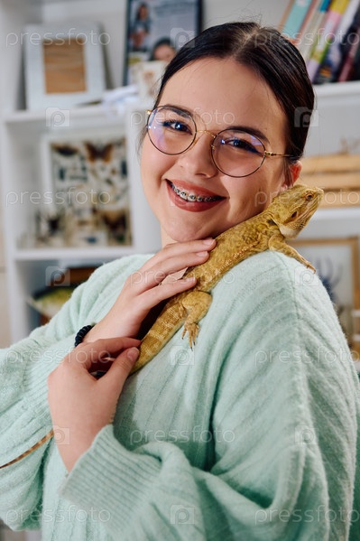 Красивая женщина позирует со своими очаровательными бородатыми драконами