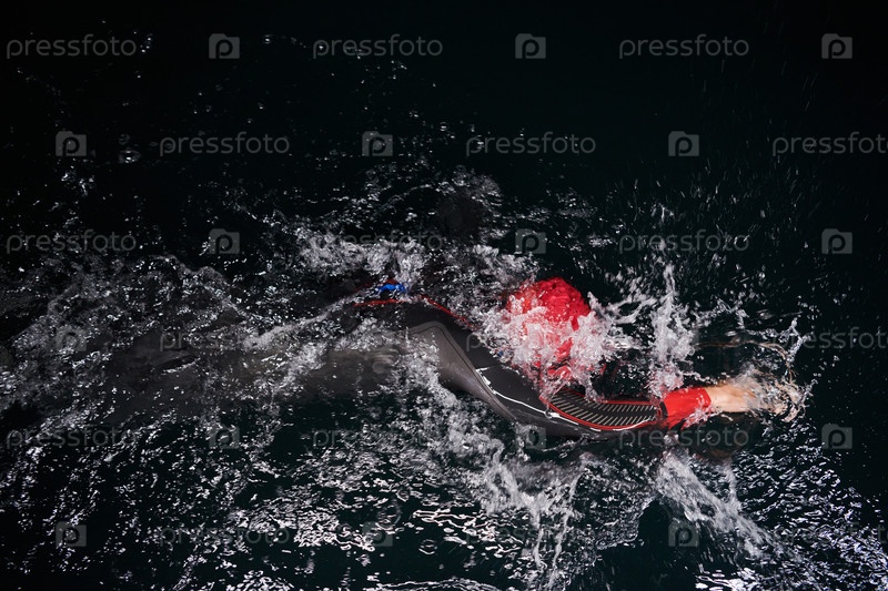 Решительный профессиональный триатлонист проходит тщательную ночную тренировку в холодной воде, демонстрируя преданность делу и стойкость в подготовке к предстоящим соревнованиям по триатлону по плаванию