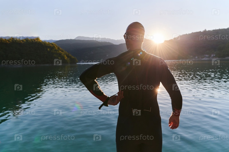 Настоящий спортсмен по триатлону готовится к тренировке по плаванию на озере