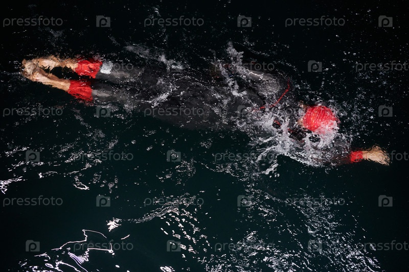 Решительный профессиональный триатлонист проходит тщательную ночную тренировку в холодной воде, демонстрируя преданность делу и стойкость в подготовке к предстоящим соревнованиям по триатлону по плаванию