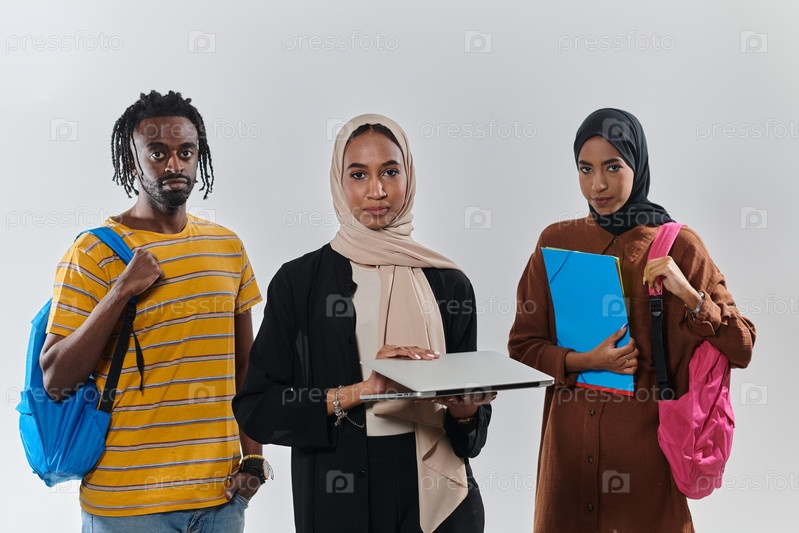 Группа студентов, в том числе афроамериканка и две женщины в хиджабе, стоят вместе на первозданно белом фоне, символизируя гармоничное сочетание культур и традиций в стремлении к знаниям и академическому совершенству