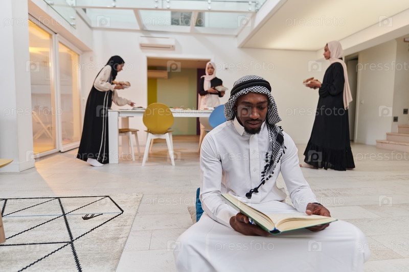 В священный месяц Рамадан афроамериканец-мусульманин, поглощенный чтением Священного Корана, окружен фоном, на котором три женщины в хиджабе готовят и подают еду для ифтара, изображая сцену духовной преданности, культурного единства и общественного праздн