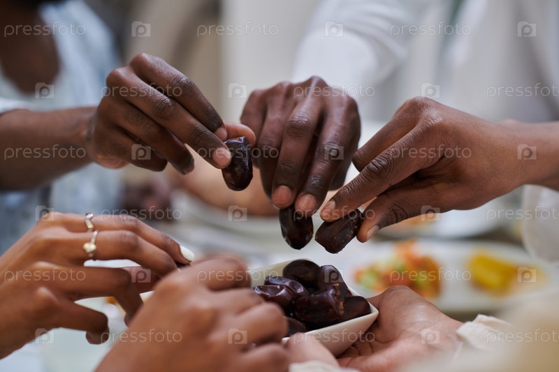 На пронзительном крупном плане разные руки мусульманской семьи деликатно сжимают свежие финики, символизируя прекращение поста во время священного месяца Рамадан, запечатлевая момент культурного единства, общих традиций и радостного ожидания общего ифтара