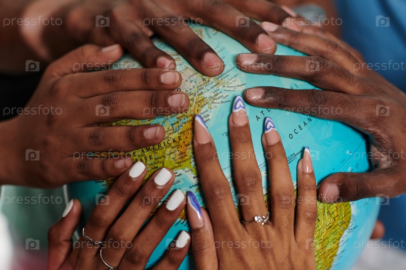 Крупный план рук разных подростков, деликатно исследующих земной шар, отражающих суть любопытства и исследований в их тактильном взаимодействии с географическими знаниями