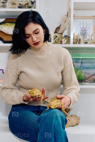 Красивая женщина позирует со своими двумя очаровательными бородатыми драконами